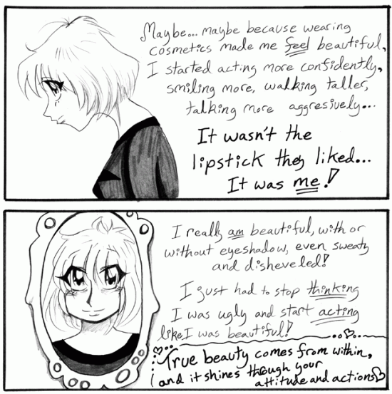 This was based on a true story. I quickly forget my own lessons, though. After jaw surgery I didn’t bother putting makeup on until the swelling had subsided. But people were smiling and treating me nicely long before I started using the stuff again, even misshapen as I was. I must have been doing something right!