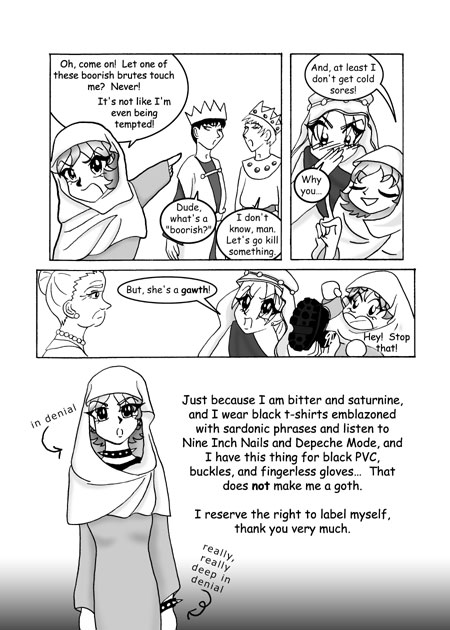 RACHEL: "Just because I am bitter and saturnine, and I wear black t-shirts emblazoned with sardonic phrases and listen to Nine Inch Nails and Depeche Mode, and I have this thing for black PVC, buckles, and fingerless gloves... That does not make me a goth."