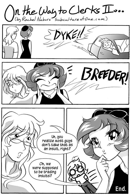 We were walking to the new cinema to see Kevin Smith’s Clerks II, and someone shouted, “Dyke!” from a passing vehicle. I don’t remember if I actually shouted, “Breeder!” back. Maybe some day I can ask my friend if I actually did. But I *do *remember we had this conversation after the event.