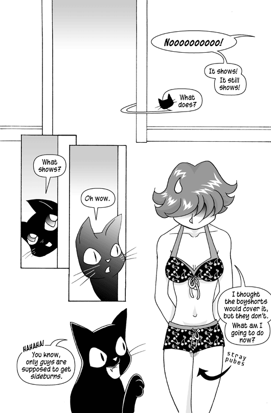 Rachel stands in her new cherry-print swimsuit, seen from behind. Arrows point to "stray pubes" showing past the boyshorts.