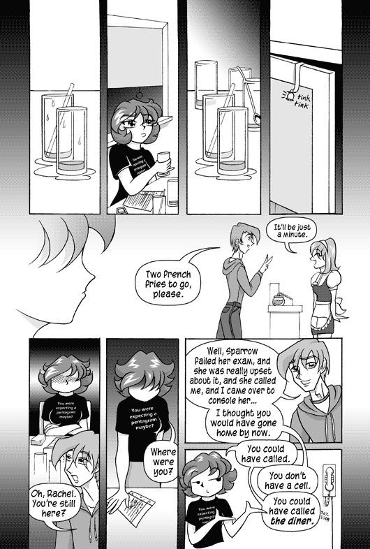 Rachel sits alone at the diner, staring at her nearly empty drink.