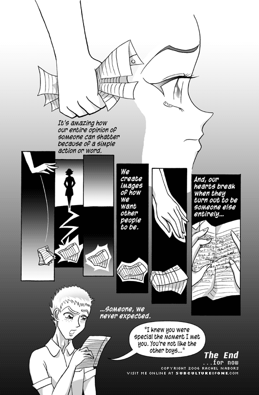 That guy in the last panel. So many of the commentors at gurl.com wanted him to come back as a future love interest. I actually had slated him to return as a love interest for Rachel way down the line, but I ended up on hiatus just before I could wrap up this whole Rachel vs. Sparrow and/or the World arc. And then I got married, so now I don’t think I’ll ever draw that story! I know how it ends: Rachel marries someone not him! She marries who I married! So the story’s totally not worth telling anymore.