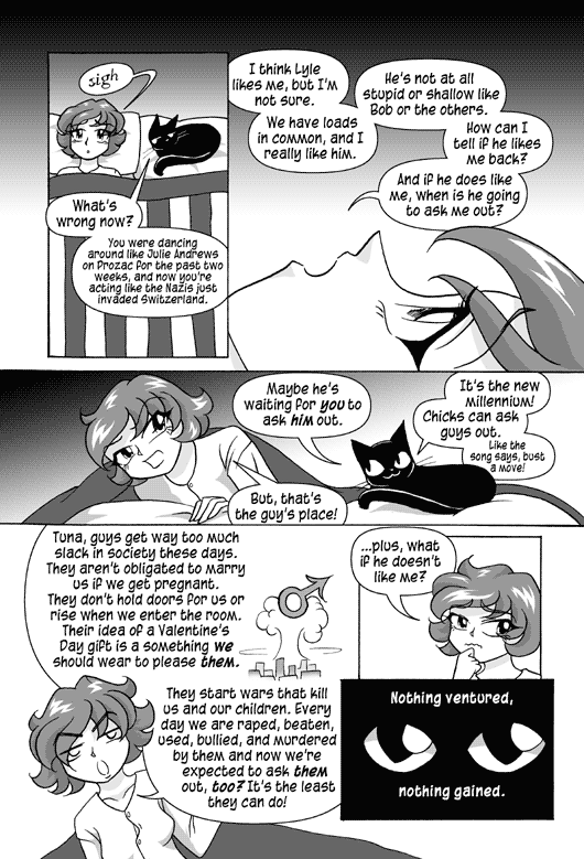 Rachel goes on a feminist rant while Tuna listens. Gender symbols appear in the background.