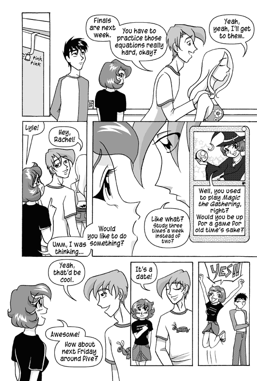 Rachel nervously approaches Lyle. A Magic: The Gathering card poster is visible on the wall.