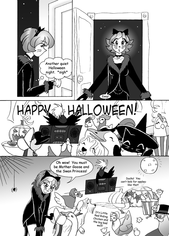 The party continues with various costumed guests including ducks, someone bobbing for apples incorrectly, someone in a red riding hood costume with a wolf, and someone in a top hat.
