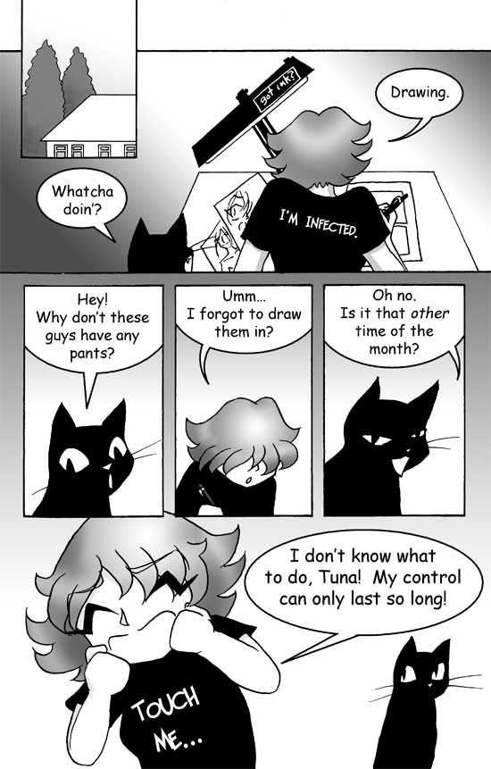 At home, Rachel works at her drawing desk wearing an Im Infected t-shirt. A sign reads Bot Ink? Tuna approaches.