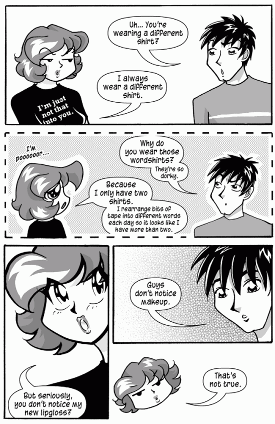 I had long thought that Rachel was (like me) super poor and thus only had a few shirts that she wrote different things on with paints or tape. However, we know from previous comics that she actually has many shirts.