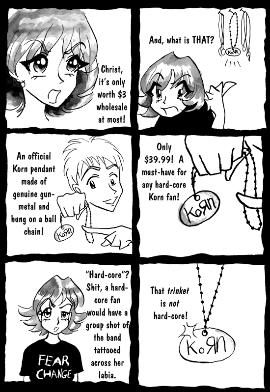 This is actually based on a true story. I was fifteen and was hanging out with another fifteen-year-old girl (which was a really rare circumstance for me, being home-schooled in the middle of Nowhere). She was crazy about Korn and was showing off her Korn necklace. I couldn’t believe she’s spent so much on it. “But it’s real gunmetal!”