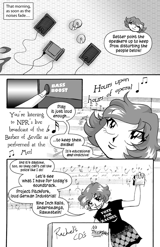 Rachel sits by her stereo with the bass boost on, listening to opera. Musical notes fill the air.