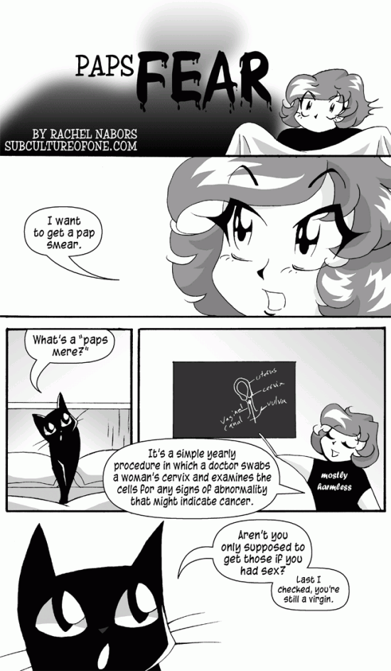 In the UK, you currently can’t get a pap smear on the NHS until you turn twenty-five, then you’re supposed to have them regularly to be on the safe side, I believe. Fun trivia from merry old England!