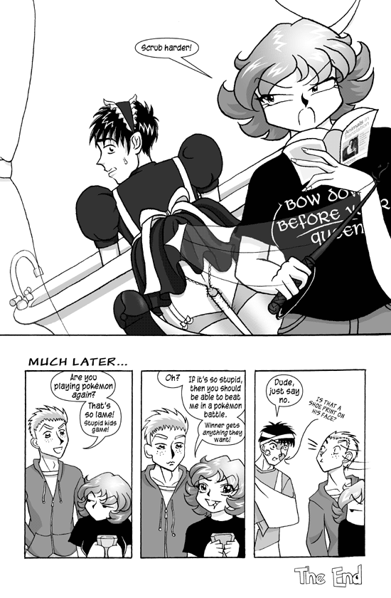 Bob is on his hands and knees in the French maid outfit, scrubbing Rachels floor with a brush. Rachel sits regally in a chair reading a book, wearing a shirt that says Bow Down Before Your Queen.