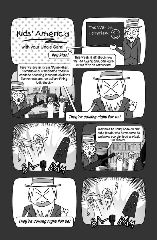 UNCLE SAM: Welcome to Iraq! Look at the cute locals who have come to welcome our glorious arrival. The suckers.