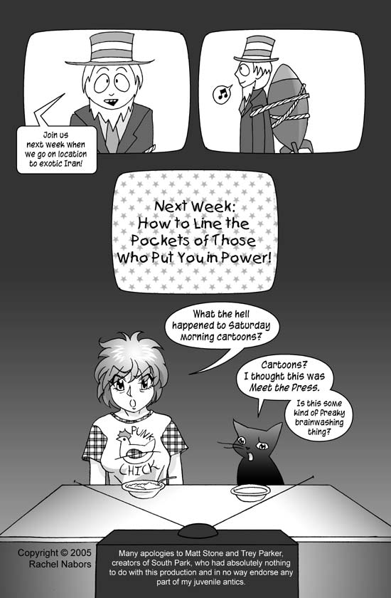 In the follow up South Park cartoon, Uncle Jimbo had to start shouting, “We have to thin out their numbers!” before shooting animals because the old excuse, “It’s headed right for us!” didn’t work on officials anymore. I wanted to make a follow up comic for this one where Uncle Sam has to change his excuse to, “We have to bring democracy to these people!” before firing on them.