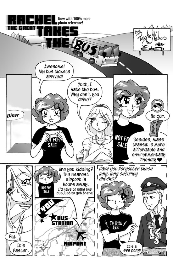I have always felt that cars are a false economy and that sooner or later, we’ll be forced to sit in the same vehicle together. Better get used it now In this comic, originally posted at gURL.com, I attempted to illustrate the many positives of riding the bus across the country, as well as give out a few of my tips.