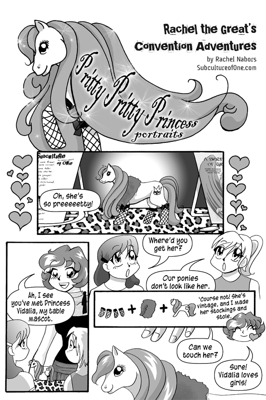 Two girls admire the pony at Rachel's convention table. A sign reads "SubcultureofOne" and "A BUNCH OF SCRAP" is visible on posters.