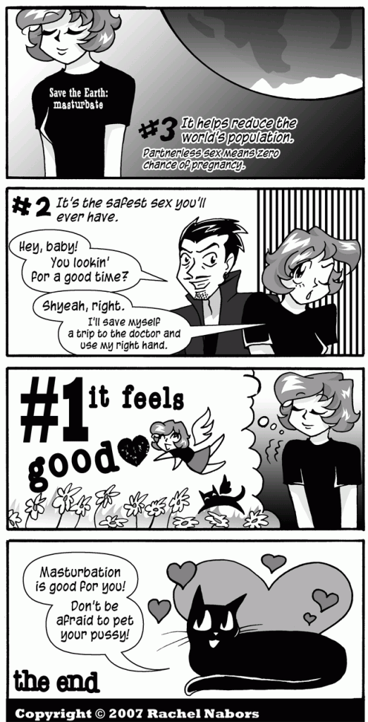 The point of all these masturbation comics is: it’s safe, there’s nothing wrong with it, you’re not a freak, and it has minimal consequences on your life, so have at it!