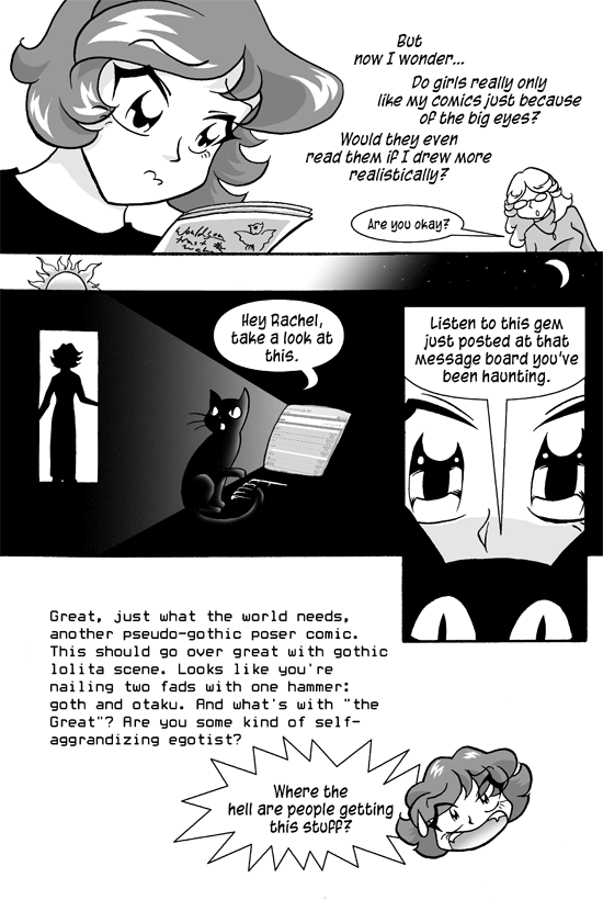 It was around this time that my comic had drawn the attention of a notorious trol board. I don’t remember the name of the board, but I noticed I was getting a lot of traffic from them, so I checked it out. I was actually kinda cool with the bad things they were saying because at that time I needed all the extra pageviews I could get to keep me in a job at gURL.com. I