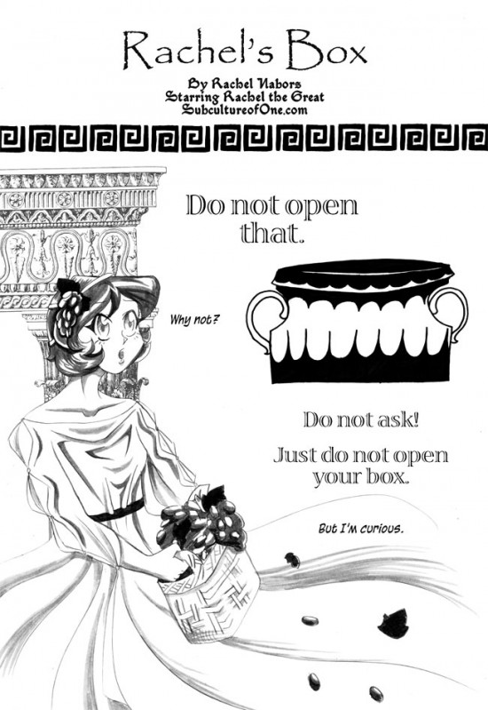 A Greek meander pattern border frames the top of the page. An ornate Greek column stands on the left. Rachel is dressed as Pandora in a flowing Greco-Roman toga/chiton with her hair styled in a classical Greek manner with a headband. She holds a bunch of grapes and looks curiously at an ornate pithos (Greek jar/box) with decorative patterns.