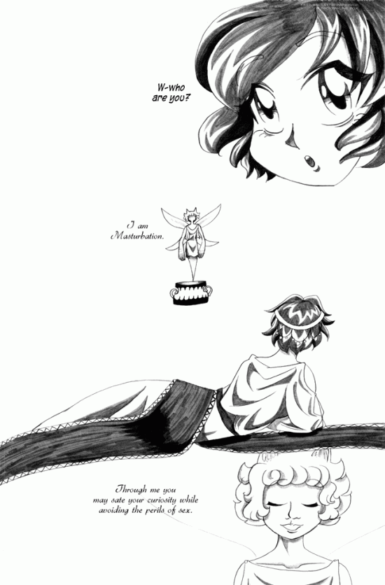 In my version, the Masturbation Fairy remains! I wish I could have drawn her up close, because she’s got a neat design: big hands, cat ears, a peplos, sharp teeth, very cat-like.