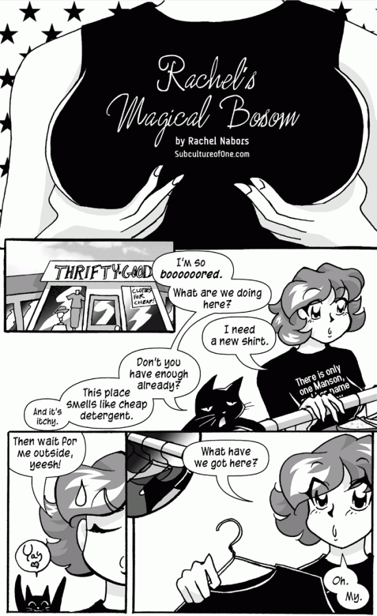 The title "Rachel's Magical Bosom" appears in elegant script over an image of a woman's chest in a black shirt with star decorations.