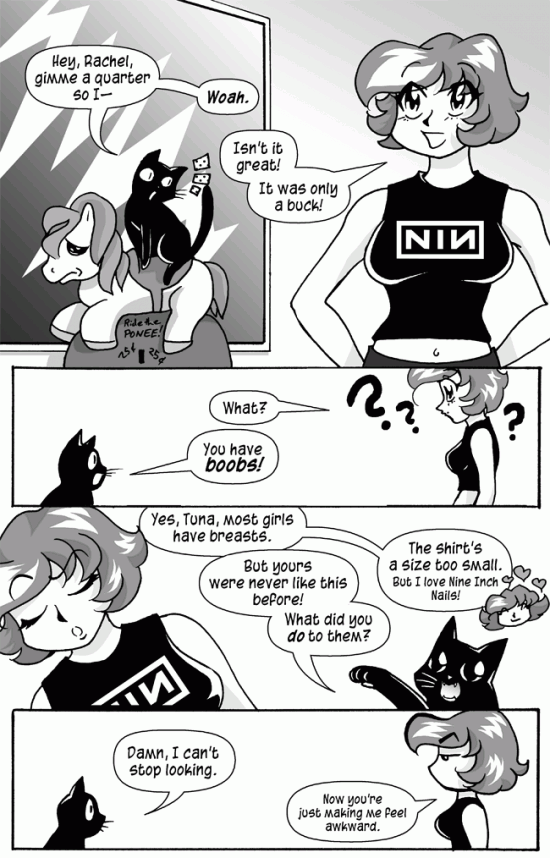 Tuna approaches Rachel, who is now wearing a tight black Nine Inch Nails shirt that shows off her figure. A mechanical pony ride labeled "Ride the PONEE!" is visible in the background.