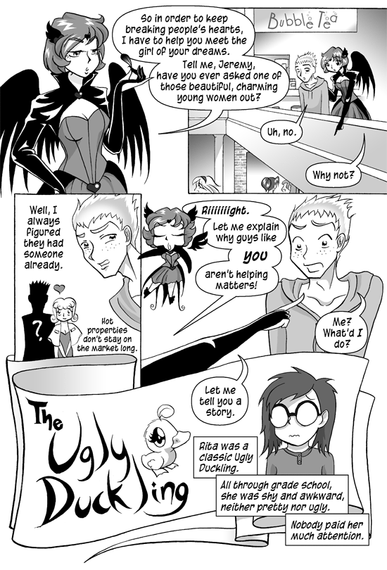 The Anti-Cupid starts telling a story, introducing "The Ugly Duckling" with an illustration showing a duckling.