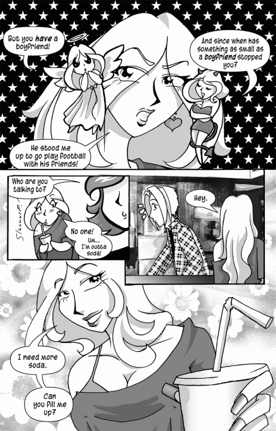 Rachel approaches Sparrow at the concession stand with a sly smile, holding an empty soda cup.