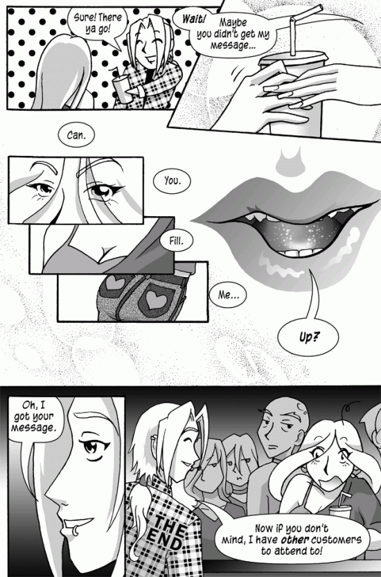 A sequence of close-up panels showing Rachel trying to be seductive: her face saying "Can.", her eye saying "You.", her lips saying "Fill.", her chest with heart shapes on her shirt saying "Me...", and finally a close-up of glossy lips.