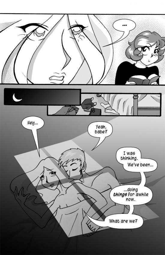 Rachel and Sparrow lie together in bed at night, moonlight casting through the window. Sparrow has short light hair and appears muscular.
