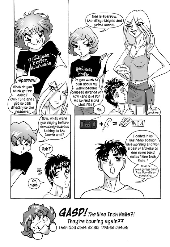 When I wrote this, Nine Inch Nails had been hibernating for five years. I was beside myself because I thought Trent wasn’t planning to ever tour again. So I wrote this mostly as wishful thinking that I would one day get to see him in concert. But, soon after I finished drawing this, ba-boom! NIN released a new album and went on tour! And I got to see them in Nashville to celebreate my 21st birthday! And I had two tickets because of a mysterious stranger who left me his no-longer-needed mosh-pit ticket in a paper bag behind the counter of a gas station! So I flitted from the pit to the bleachers all night!