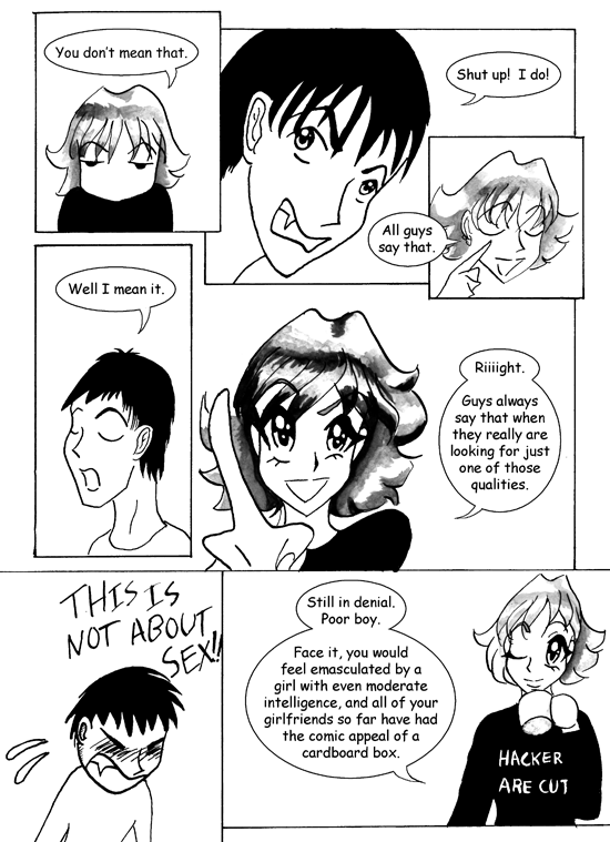 RACHEL: "Face it, you would feel emasculated by a girl with even moderate intelligence, and all of your girlfriends so far have had the comic appeal of a cardboard box."