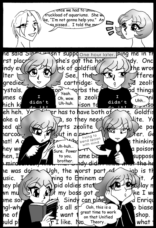 That isn’t just random text in the background. I wrote a long monologue about working at Pets Conglomerated and how you have to put zeolite crystals into the filters in goldfish tanks or the ammonia will kill them. That’s the sort of thing I would actually monologue about!