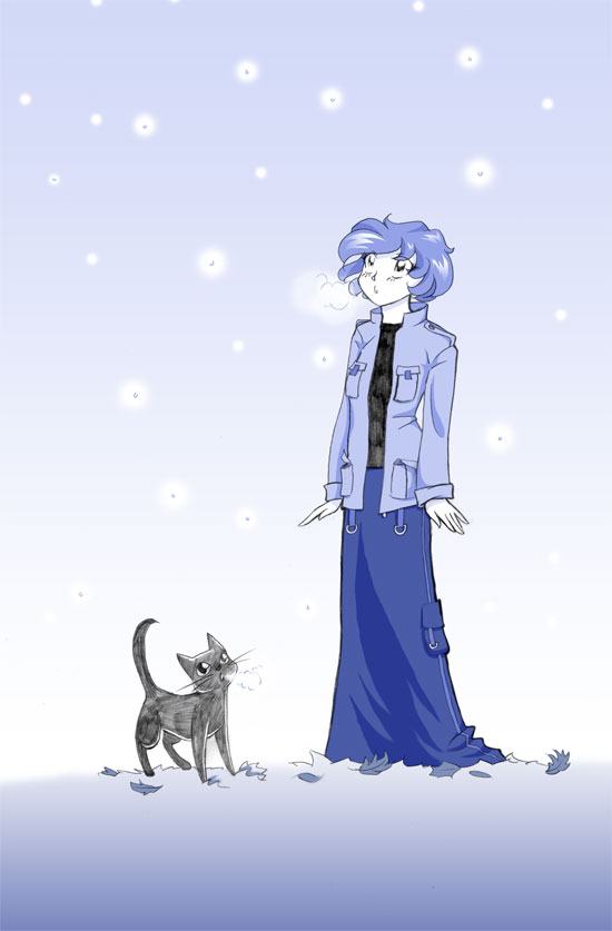 On the last page, Rachel’s outfit was still grey, and here I have replace all the greys with blue except for Tuna. I think it would have been more impactful if I had known how to color pencil lines with alpha masks back then. I could have made him navy, and this page would have even more punch.