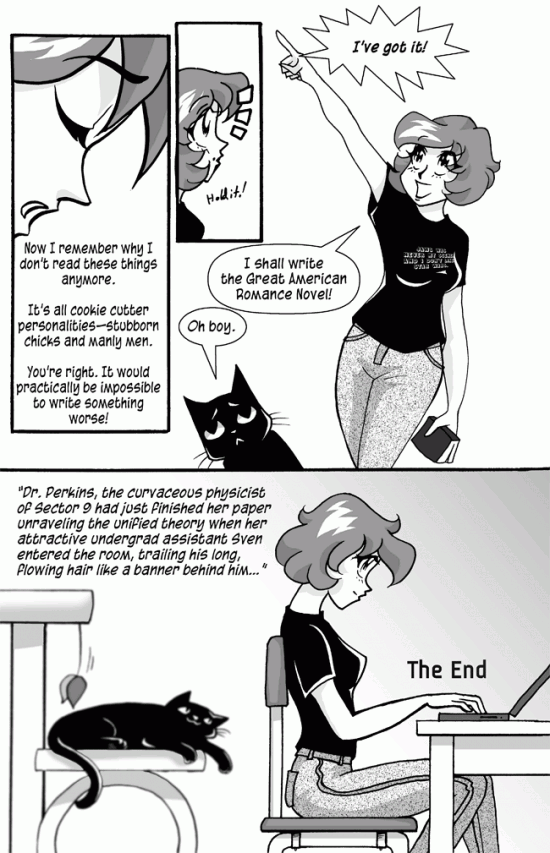 RACHEL (narrating/typing): "'Dr. Perkins, the curvaceous physicist of Sector 9 had just finished her paper unraveling the unified theory when her attractive undergrad assistant Sven entered the room, trailing his long, flowing hair like a banner behind him...'"