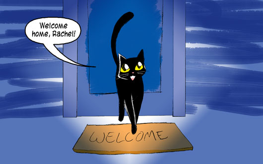 Tuna the cat stands in an open doorway on a welcome mat, greeting Rachel.