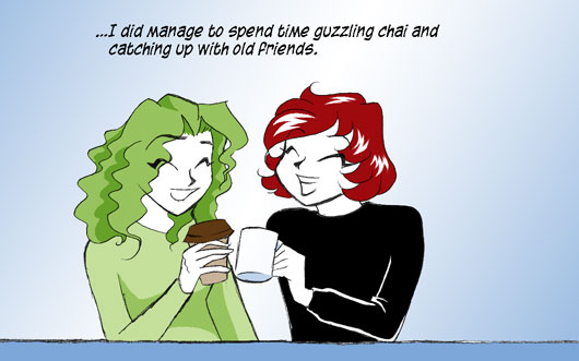 Mar 14, 2007 The Housesitter Comic, Part 4, Page 5 ▶ Transcript PANEL 1 Rachel sits with a friend with green hair, both enjoying hot drinks and laughing. CAPTION: "...I did manage to spend time guzzling chai and catching up with old friends." ← The Housesitter Comic, Part 4, Page 4 The Housesitter Comic, Part 4, Page 6 → I can’t remember who it was I caught up with over chai. I question whether or not it ever happened now.