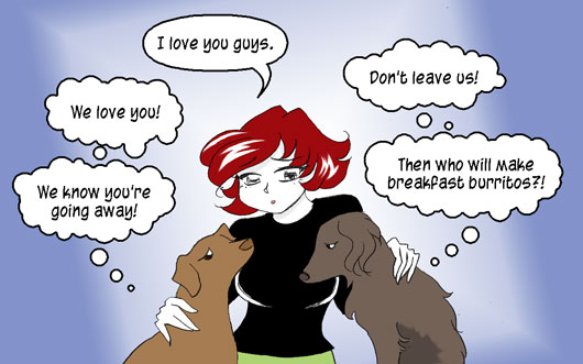 I love how they love Rachel inasmuch as she is a provider of burritos. (I never fed them burritos, but there was always a look of hope on their faces when they’d come watch me in the kitchen, tails wagging.) I slid that bit in here to keep the dialog from getting too saccharin.