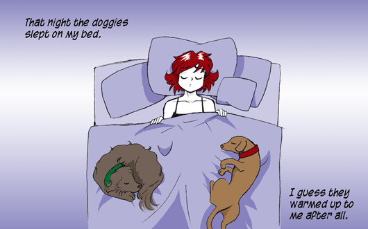 Doggies in the bed is the best thing ever. I don’t let my husband’s dog on the bed because he sheds so much white hair, but when I visit my mom, my dog Kitty gets to cuddle up with me every night. There is no greater joy than a furry loved one to spoon!