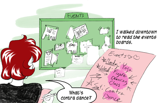 NARRATION: "I walked downtown to read the events boards."