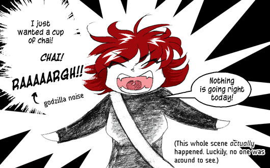 Feb 28, 2007 The Housesitter, Part 2, Page 20 ▶ Transcript PANEL 1 Rachel throws her head back and screams in frustration with dramatic action lines. RACHEL: "I just wanted a cup of chai!" RACHEL: "CHAI!" RACHEL: "RAAAAARGH!!" Label: "godzilla noise" RACHEL: "Nothing is going right today!" (This whole scene actually happened. Luckily, no one was around to see.) ← The Housesitter, Part 2, Page 19 The Housesitter, Part 2, Page 21 → Luckily, no one was around to hear my Godzilla-esque wail of displeasure. The cafe is in the middle of a field. But wail I did, to no effect.