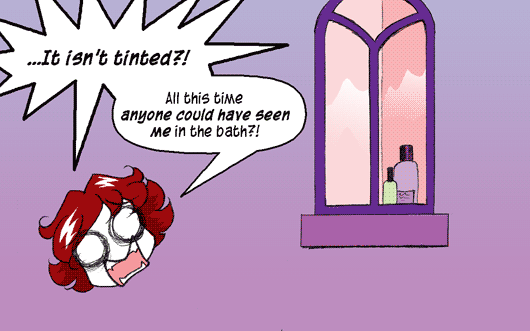Feb 28, 2007 The Housesitter, Part 2, Page 23 ▶ Transcript PANEL 1 Rachel is horrified, looking at the bathroom window from inside. RACHEL: "...It isn't tinted?!" RACHEL: "All this time anyone could have seen me in the bath?!" ← The Housesitter, Part 2, Page 22 The Housesitter, Part 2, Page 24 → The owners of the house assured me that the window was in fact not visible from the road. Then why was I able to see inside it so well? Moops!