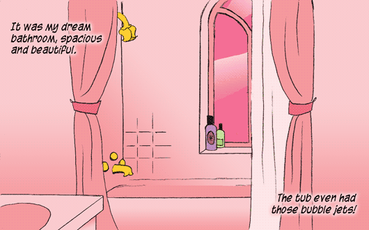 Feb 28, 2007 The Housesitter, Part 2, Page 3 ▶ Transcript PANEL 1 A luxurious pink bathroom with pink curtains, a rubber duck, and bath products in the window. Caption: It was my dream bathroom, spacious and beautiful. Caption: The tub even had those bubble jets! ← The Housesitter, Part 2, Page 2 The Housesitter, Part 2, Page 4 → I can’t remember if the bathroom was actually that pink, or if it just felt that way.