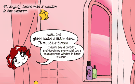 RACHEL: "I don't see a curtain, and surely no one would put a transparent window in their shower..."