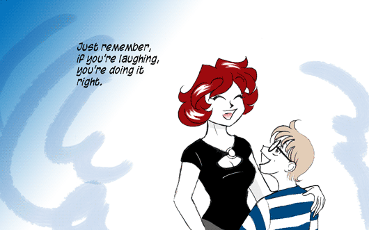 Mar 7, 2007 The Housesitter, Part 3, Page 14 ▶ Transcript PANEL 1 Rachel and her young partner smile at each other. Caption: Just remember, if you're laughing, you're doing it right. ← The Housesitter, Part 3, Page 13 The Housesitter, Part 3, Page 15 → Yeah, contra dancing is definitely one of my best memories. Comments (Archived) Falcon Whitaker 2007-03-07 I love this philosophy for life