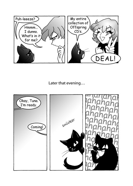 Background filled with "hahaha" text as Tuna bursts into uncontrollable laughter, falling over.