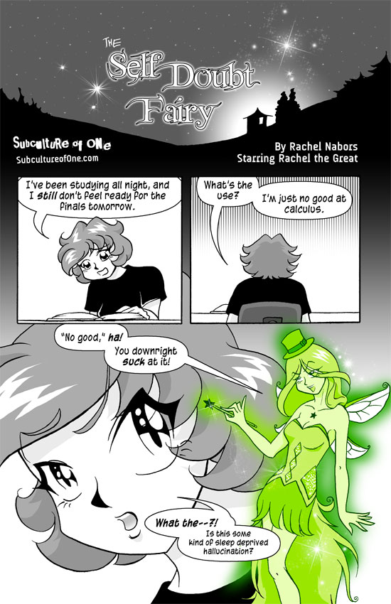 squeals with glee This is one of my FAVOURITE of the comics you ever made! I still refer to my own moments of self-doubt as the Self-Doubt Fairy just because of this comic. I love it