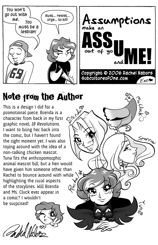 AUTHOR'S NOTE: "This is a design I did for a promotional piece. Brenda is a character from back in my first graphic novel, 18 Revolutions. I want to bring her back into the comic, but I haven't found the right moment yet. I was also toying around with the idea of a non-talking chicken mascot. Tuna fits the anthropomorphic animal mascot bill, but a hen would have given him someone other than Rachel to bounce around with while highlighting the rural aspects of the storylines. Will Brenda and Ms. Cluck ever appear in a comic? I wouldn't be surprised!"