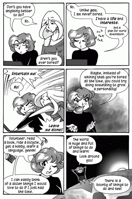 RACHEL: "Maybe, instead of whining that you're bored all the time, you could try doing something to grow a personality!"