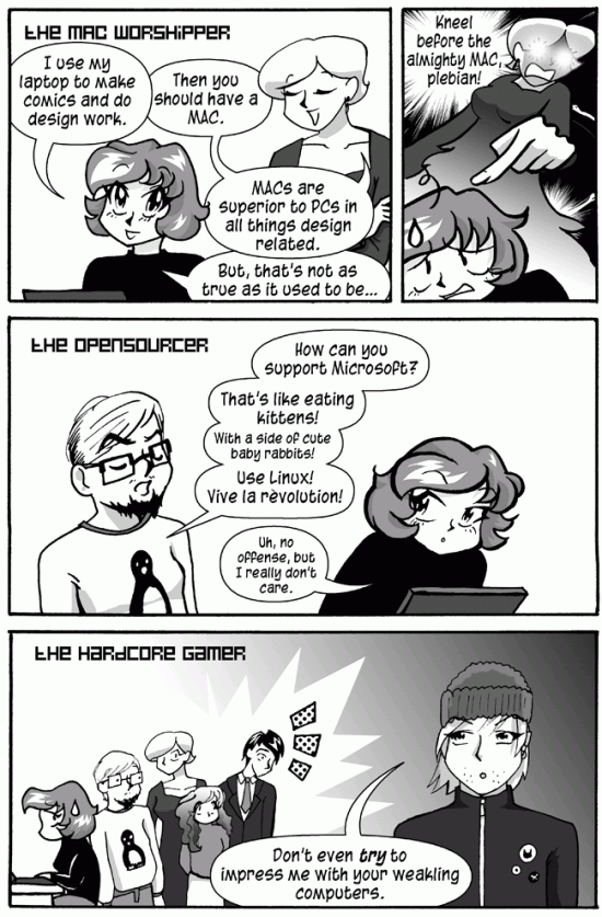 I love the Opensourcer (or is that opensorceror?)! And the Hardcore Gamer is so hot. Secretly, I would only draw hotties I would want to make out with. You can spot them in my comics by their long, flowing hair.