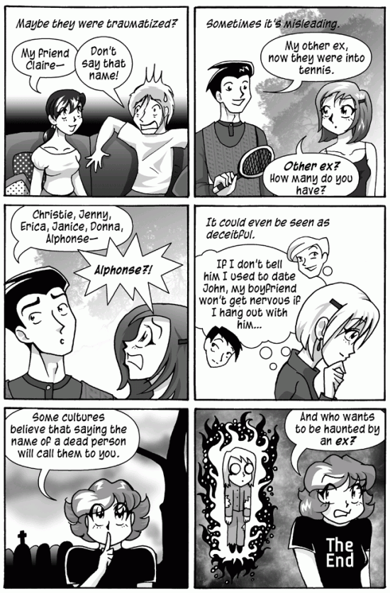 Such is not so for some of my other friends…which leads to some very confusing conversations! lol. I've had many an incident like on page one of this comic where I'm like "Wait…which she/he are we talking about now??" It's like everyone's ex is Voldemort!